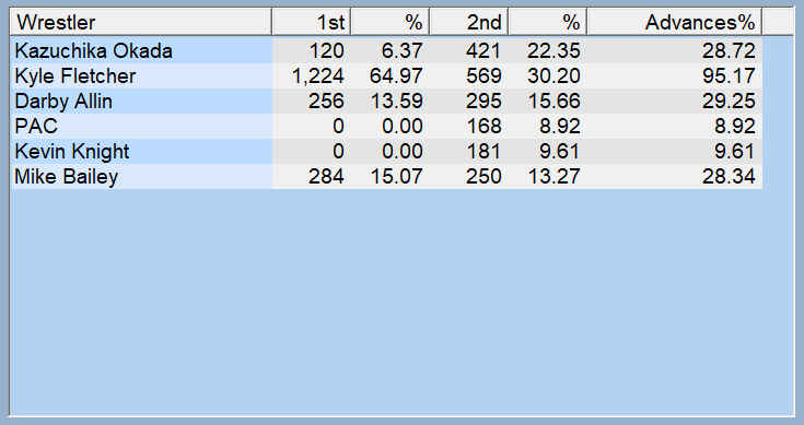 In this case, Kyle Fletcher would get 1st place, Kazuchika Okada would advance as runner-up, and PAC would be eliminated.