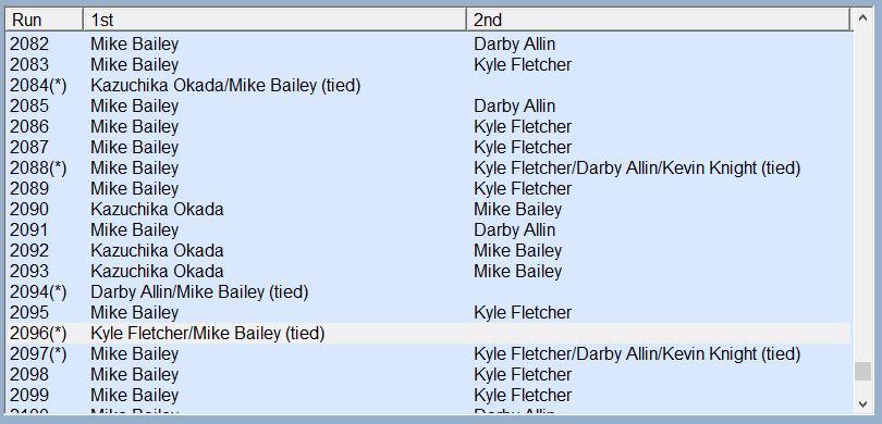 The list on the lower right of the program window shows a list of a maximum of 20,000 individual group outcomes.Runs with unbreakable ties are denoted by a ''(*)'' next to the run number.