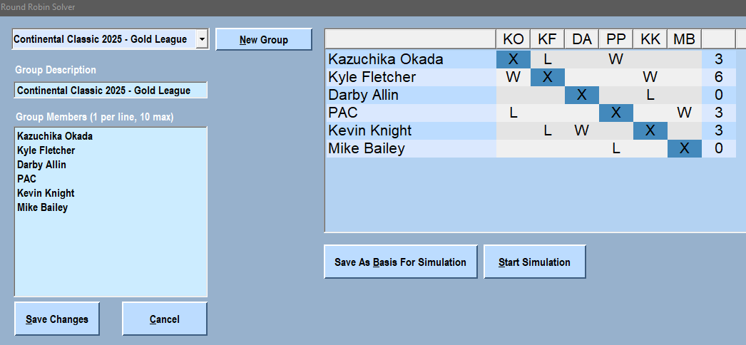 Finally - and this step is optional -, you may pre-populate some of the group's match results and save this selection as your base case.These results will then always be brought up on the main screen when you pick a group from the dropdown menu.