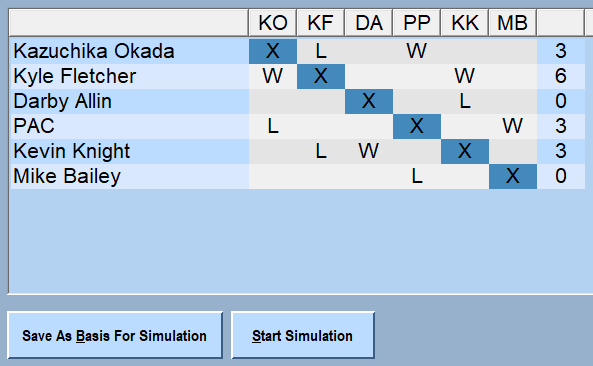 To set the result of a match, double-click the corresponding cell. This will cycle through Blank -> W -> L -> D -> Blank, and any changes you make to one side of the match will automatically be applied to the other side of the match as well.